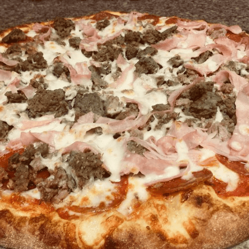 Pizza sauce, mozzarella cheese, meatballs, sweet Italian sausage, pepperoni and ham.