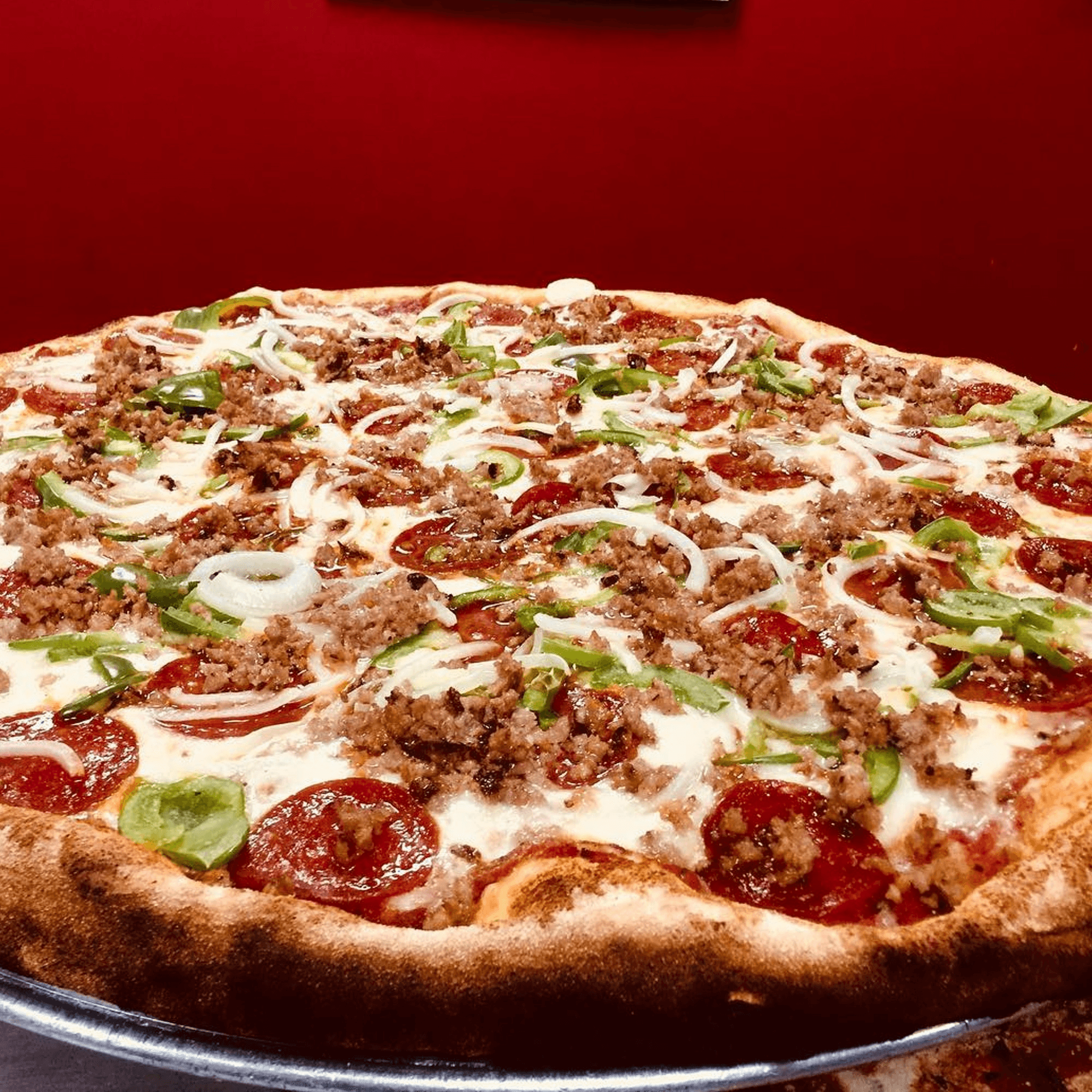 Pizza sauce, mozzarella cheese, pepperoni, sweet Italian sausage, onions, green peppers and garlic.