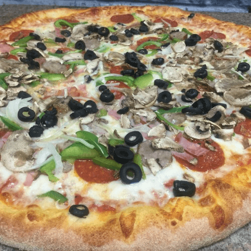 Pizza sauce, mozzarella, pepperoni, sausage, ham, onions, green peppers, mushrooms and black olives.
