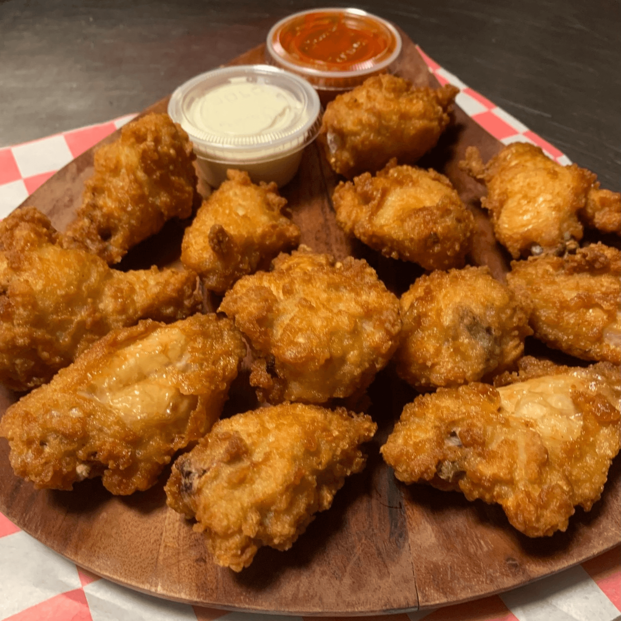 Breaded chicken, onion, cheddar cheese topped with smoked Hickory BBQ sauce.